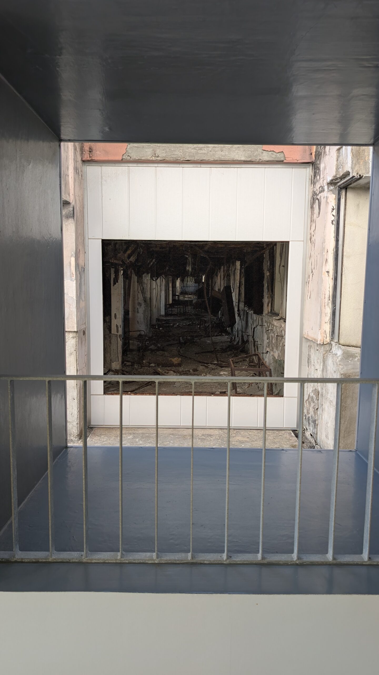• 外部通路から見る焼け焦げた校舎